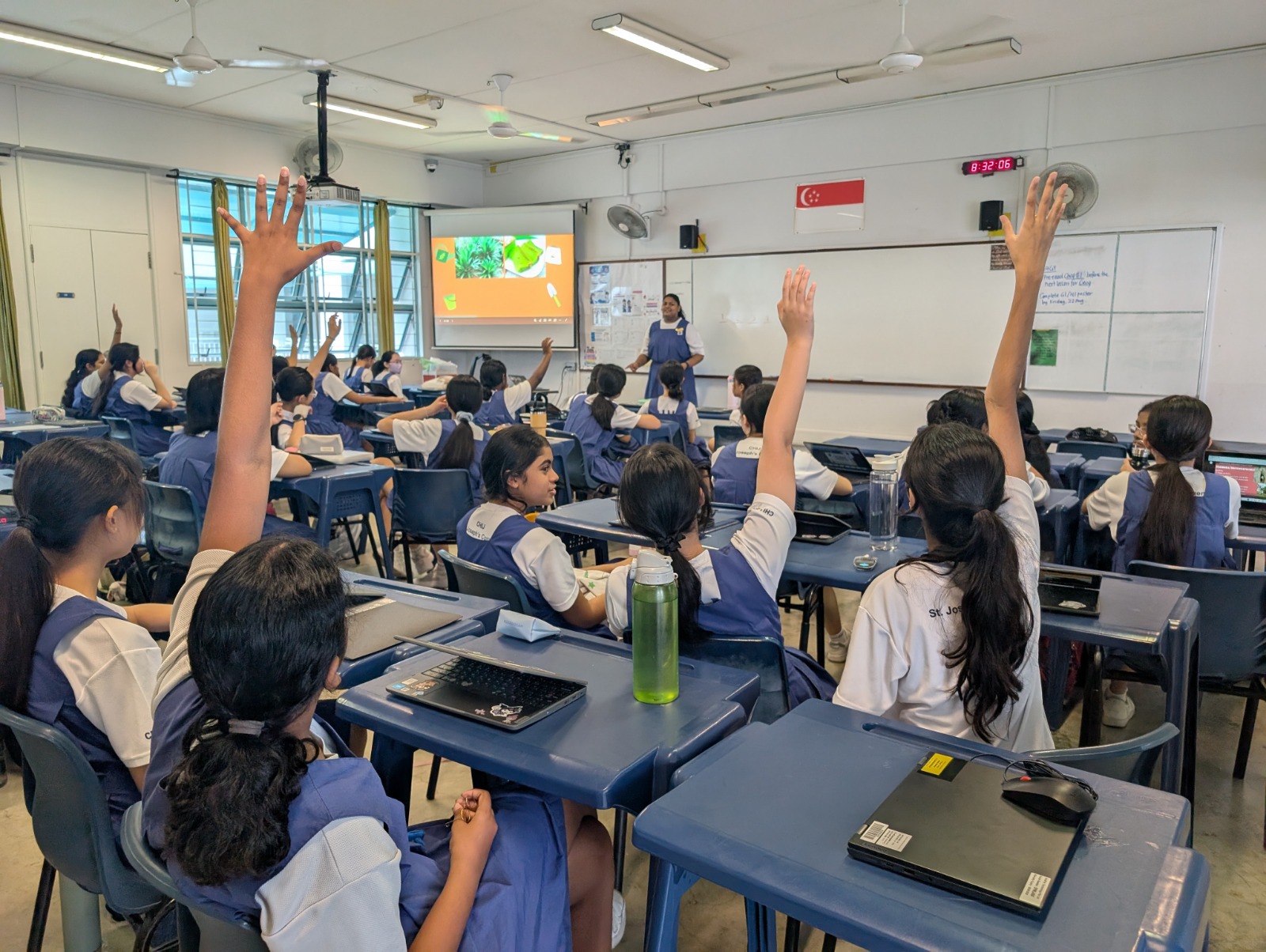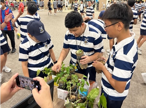 The team organised engaging activities such as an Amazing Race teaching Secondary 3 students about water conservation and recycling, Saints' Care Day featuring carnival style games, upcycling workshops with elderly beneficiaries, and hands-on sessions creating terrariums, self-watering plant systems, and fruit enzyme fertilisers from food waste.