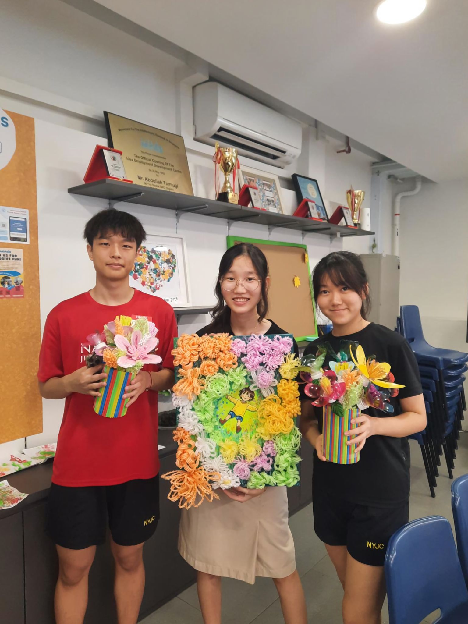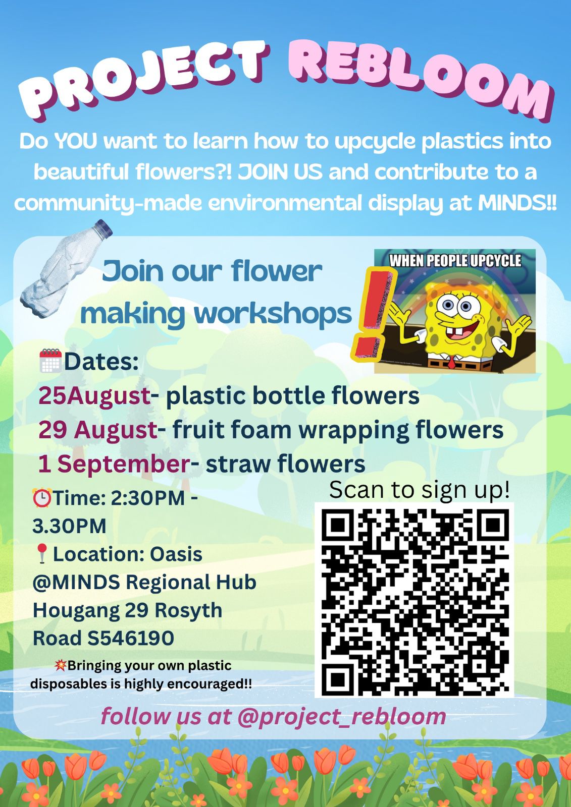 The team complemented these workshops with an educational campaign via Instagram, sharing posters, infographics, and practical eco-tips to broaden their reach. A mini exhibition at MINDS showcased collaborative artworks, including pieces crafted from fruit foam wrappers and donated flowers.