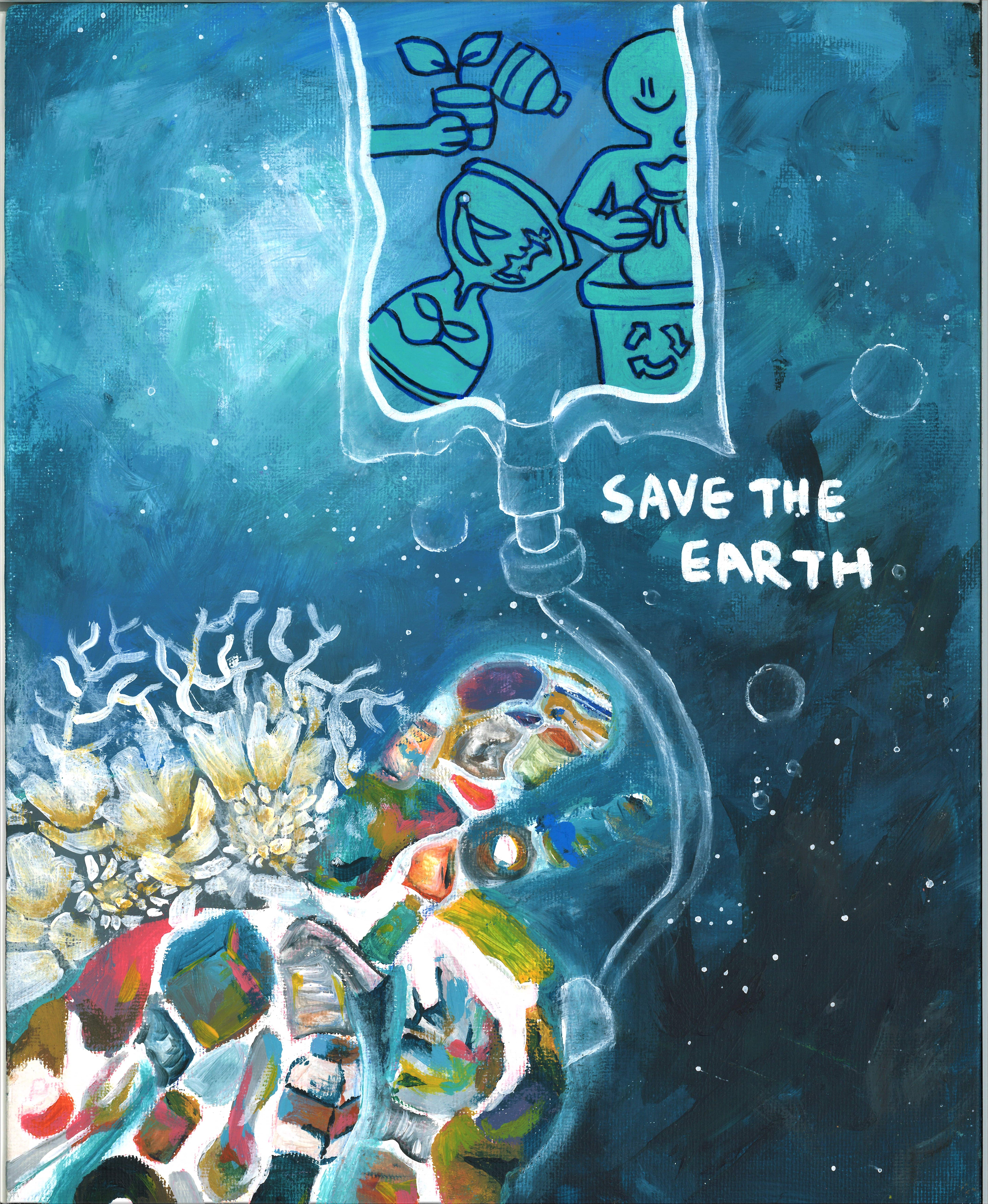 | This artwork is a powerful visual metaphor highlighting the urgent need to revive and protect our planet. It portrays Earth as a fragile patient receiving a life-saving IV drip filled with symbols of sustainability like recycling, planting, and conservation. The oceanic background filled with coral and marine life entangled in trash, emphasizes the devastating impact of pollution. Through the contrast between destruction and healing, the painting calls for collective action and environmental responsibility. It is a reminder that just as we care for human health, we must also care for the health of our Earth |   Save the Earth by Chong Yu Xuan |