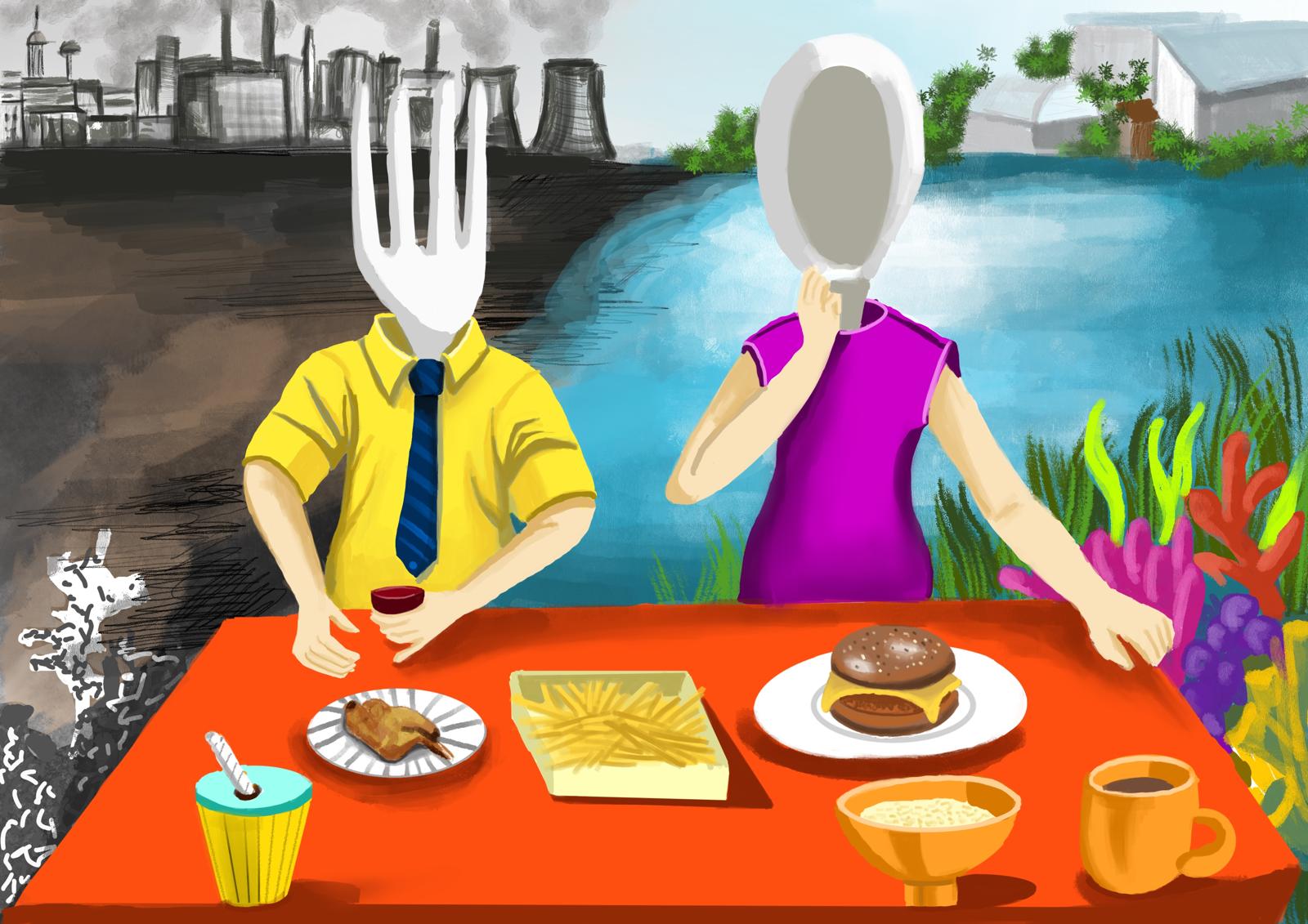 | This artwork contrasts the impact of disposable versus reusable items. On the left, a disposable fork and cutlery are shown, alongside a polluted, dirty lake with dead coral caused by trash in the ocean. On the right, a reusable spoon and cutlery accompanies a clean lake with thriving coral. This visual illustrates the consequences of choosing disposables over reusables. This piece inspires viewers to reduce disposable use and embrace reusables instead. |   Our Choice, Our Planet by Lucus Lim Shi Hong |