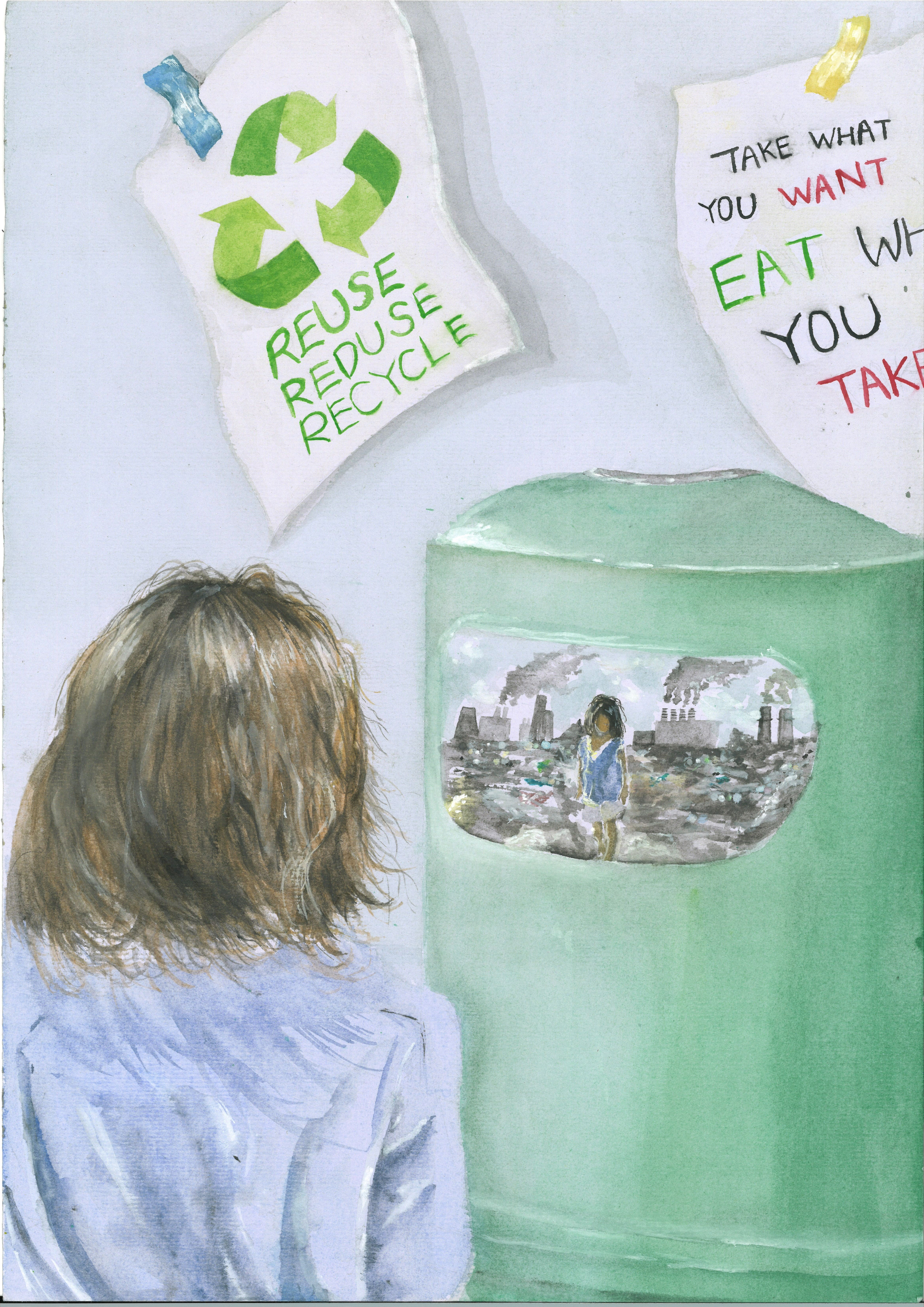 | This thought-provoking artwork delivers a strong environmental message through symbolism and emotion. A girl stands before a green bin, reflecting on the polluted world inside it, highlighting the consequences of waste. Above her, two posters read “Reuse, Reduce, Recycle” and “Take what you want, eat what you take,” reminding us to be mindful of our actions. The muted colours and smoky skyline within the bin create a stark contrast to the real world, urging viewers to take responsibility. This piece powerfully encourages sustainable habits and emphasizes that every choice we make affects the future of our planet. |   Reflecting the Reality by Liew Xuan Ru |