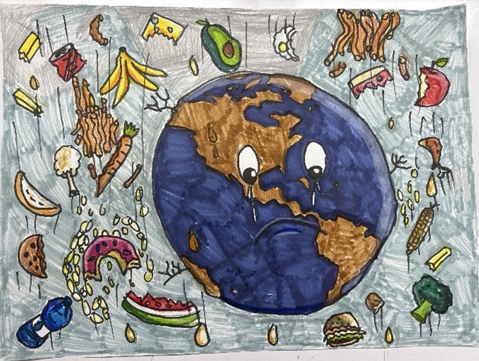 | This powerful artwork shows Earth with a sad face, surrounded by food waste like fruit, snacks, and vegetables. The scattered items serve as a reminder of how much food is thrown away every day. When we waste food, we’re not just wasting a meal—we’re wasting the water, energy, and hard work that went into growing, harvesting, and bringing that food to us. Food waste also contributes to pollution and harms our environment. Let’s make Earth happy again by taking only what we need, finishing our meals, and keeping our leftovers for later. Every little action counts. Together, we can reduce food waste and care for our planet. |   The Earth Is Sad When We Waste Food by Alexander Neo Han Hao |
