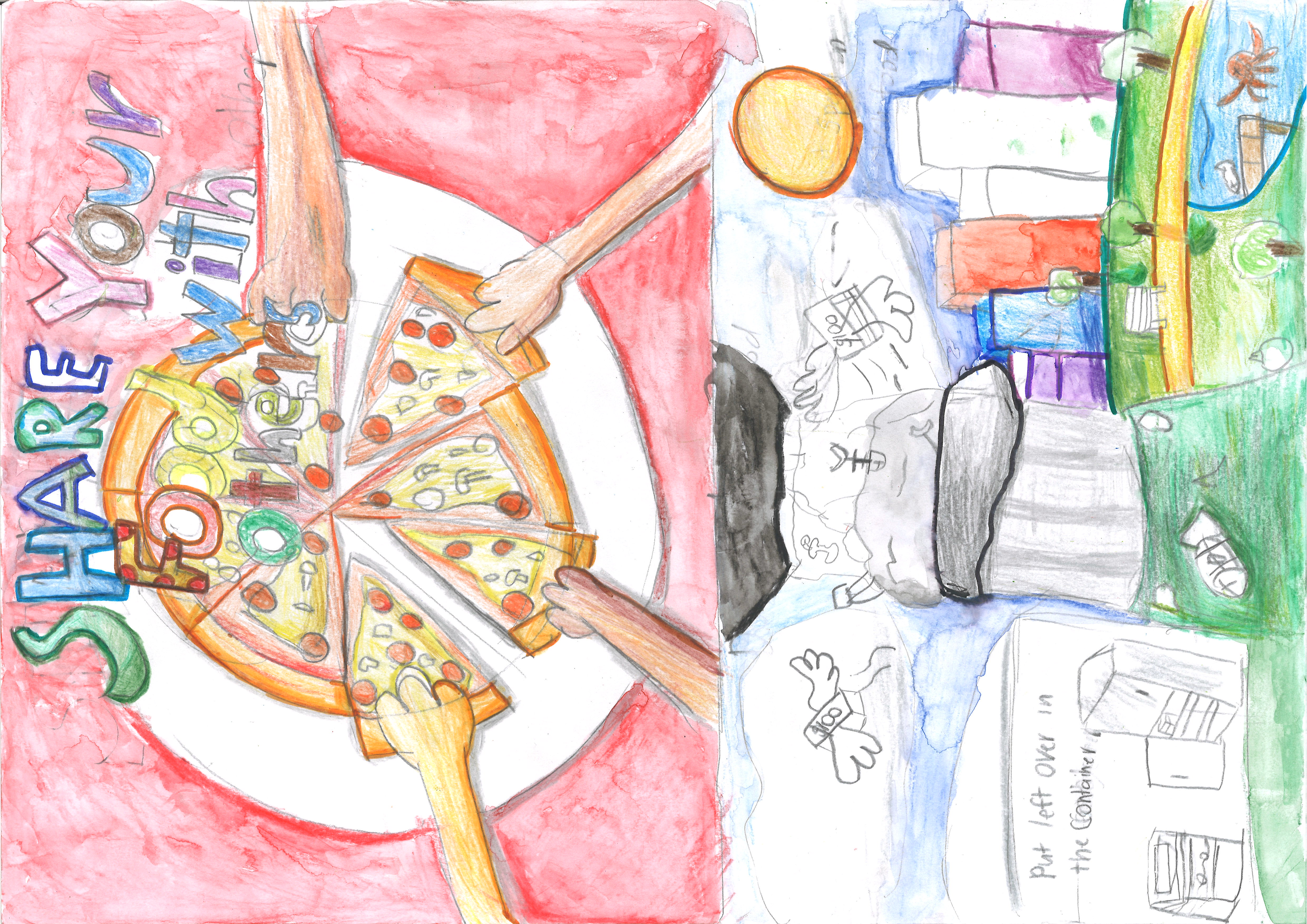 | This artwork depicts a pizza with hands reaching out to grab it, reminding us to share food rather than throwing it away. Too many people discard food that could still be eaten or given to someone else. The choices we make can help reduce food waste. When we waste food, we’re not just wasting money- we are also hurting our planet. This drawing encourages us to take only what we can finish and share what’s leftover with others. Share your slice, do not let it go to waste! |   Share The Slice, Save The Earth by Siti Zahidah Binte Aziz |