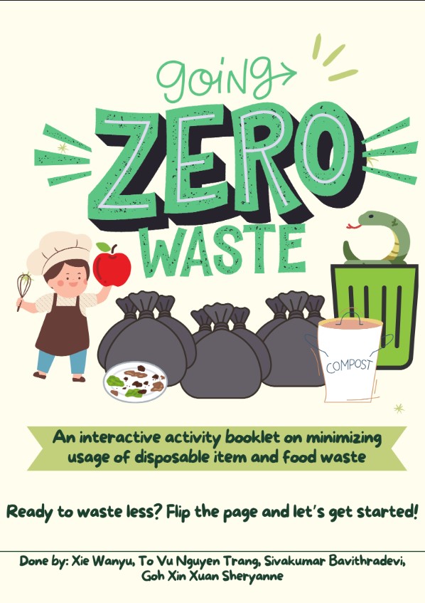 | The project team's activity booklet aims to make learning about waste reduction fun, simple and actionable. It starts off with a modified version of the classic Snake and Ladder game to teach players fun facts and bite-sized tips to reduce waste. The second activity, Cook a Dish, suggests recipes promoting creative usage of leftovers in cooking to reduce wastage. Their third activity teaches participants the basic principles of waste sorting and composting, an important yet often overlooked aspect of waste reduction. The final activity is an interactive Bingo challenge that motivates participants to put waste-reducing tips they learnt into practice over a period of 30 days. Overall, the team hope to show that reducing waste does not require drastic changes, but small, mindful actions. They wanted to encourage their peers and their families to think twice before generating waste, be more aware of the waste problem globally and to pick up waste-reducing habits. Click here to view the booklet! |   Going Zero Waste! by Nanyang Junior College |